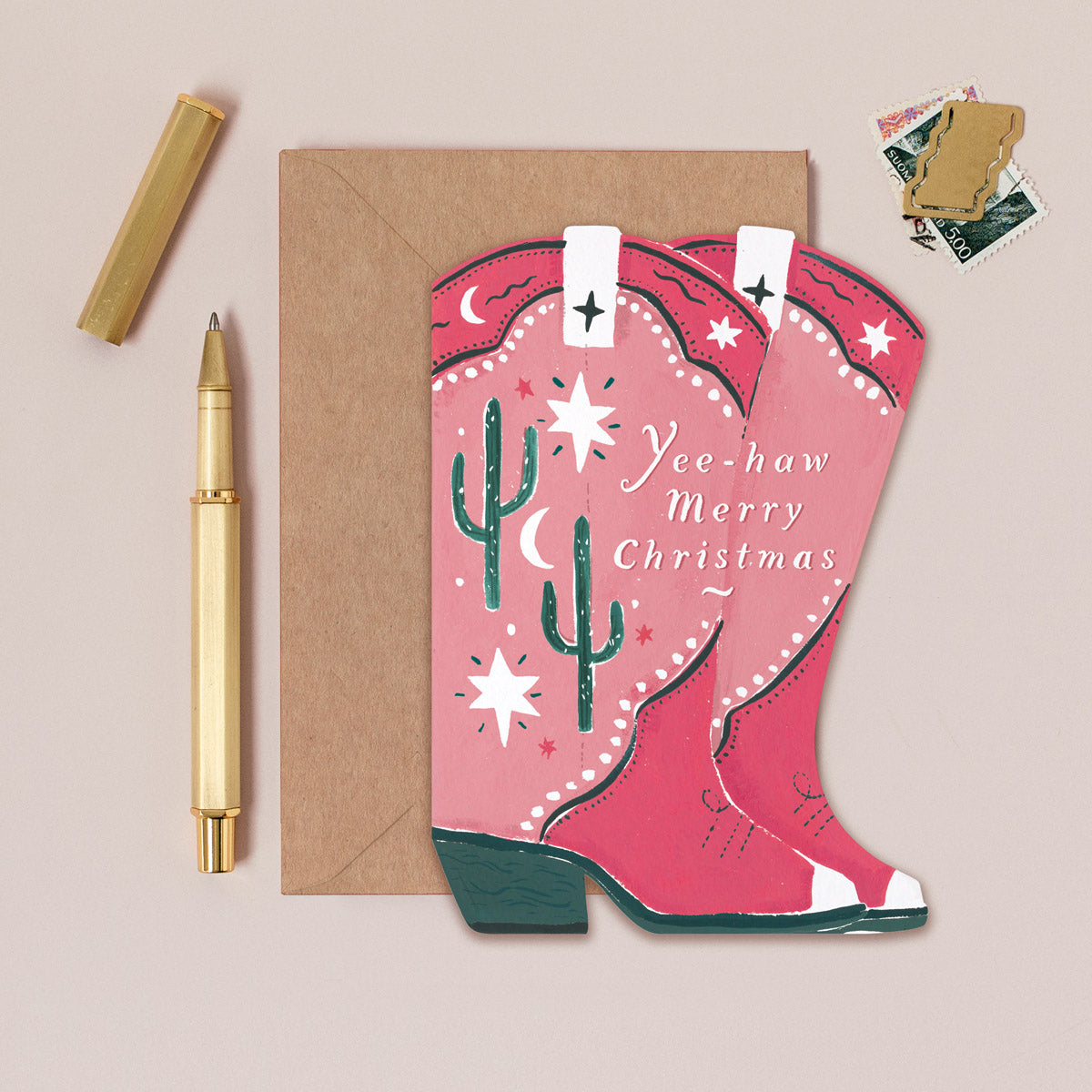 Yee Haw! Get rowdy this Christmas with a sprinkle of western vibes with this Cowboy Boots Christmas card. The holiday card is cut into the unique shape of a stunning pair of red cowboy boots with a pattern of cacti, stars and moons with a “Yee-haw Merry Christmas caption”. Paired with a 100% recycled kraft paper envelope this holiday greetings card is blank inside.