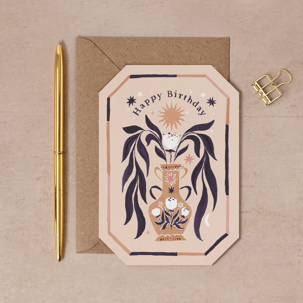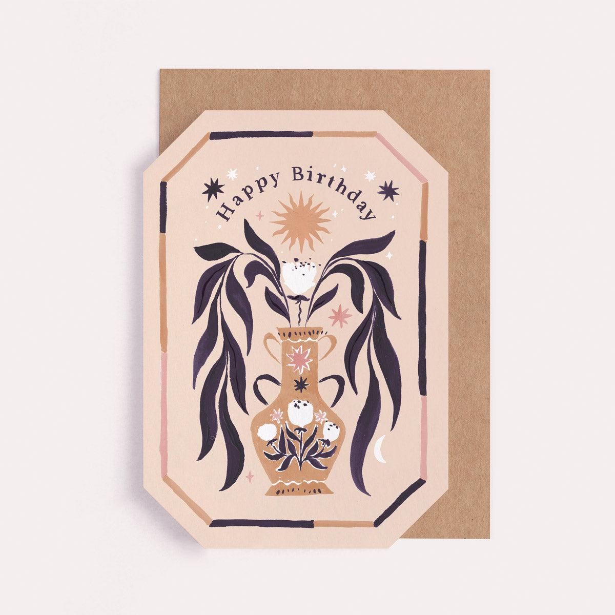 Lush leafy fronds cascade from the decorated vase in the centre of this birthday card, bordered in a coordinating colourful frame that highlights the card’s unique gem shape.