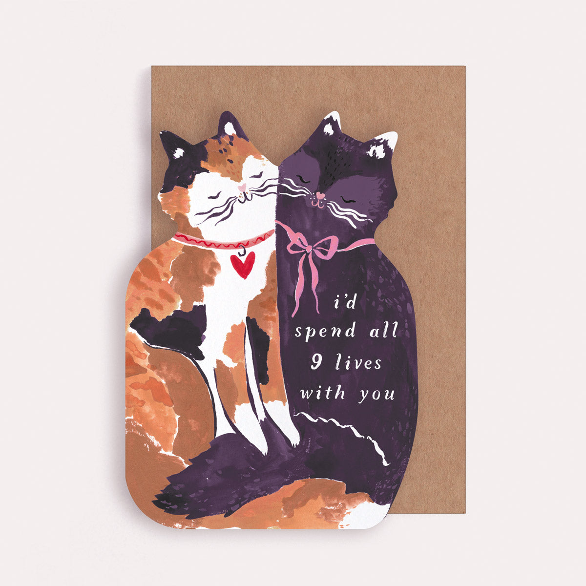 The perfect anniversary card or Valentine's card for a cat lover, this uniquely shaped greeting card is cut into the shape of two snuggling cats.