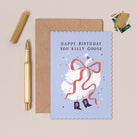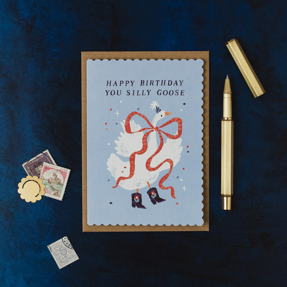This whimsical birthday card is the perfect gift for anyone with a love of the ludicrous! The hand-lettered caption reads "Happy Birthday You Silly Goose", headlining over the stunning hand-illustrated artwork of a stylish white goose flaunting purple embroidered cowboy boots, a party hat and an enormous red ribbon tied in a bow. The light blue background of the silly goose birthday card ends in a shaped scalloped edge, adding an extra touch of magic to the unique design. Add your own handwritten message to the blank inside of the funny birthday card for that personal touch.
