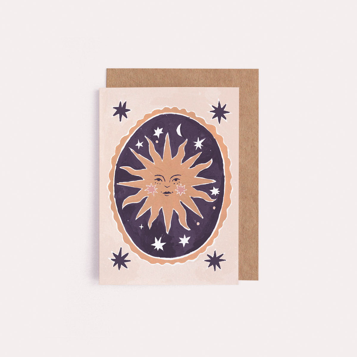 A smiling sun radiating joy and happiness stands out in a starry night sky enclosed by a painted frame. The blank mini card is hugely versatile, making the perfect finishing touch to gifts for any occasion, whether as a birthday card, thank you card, or love card.