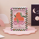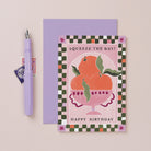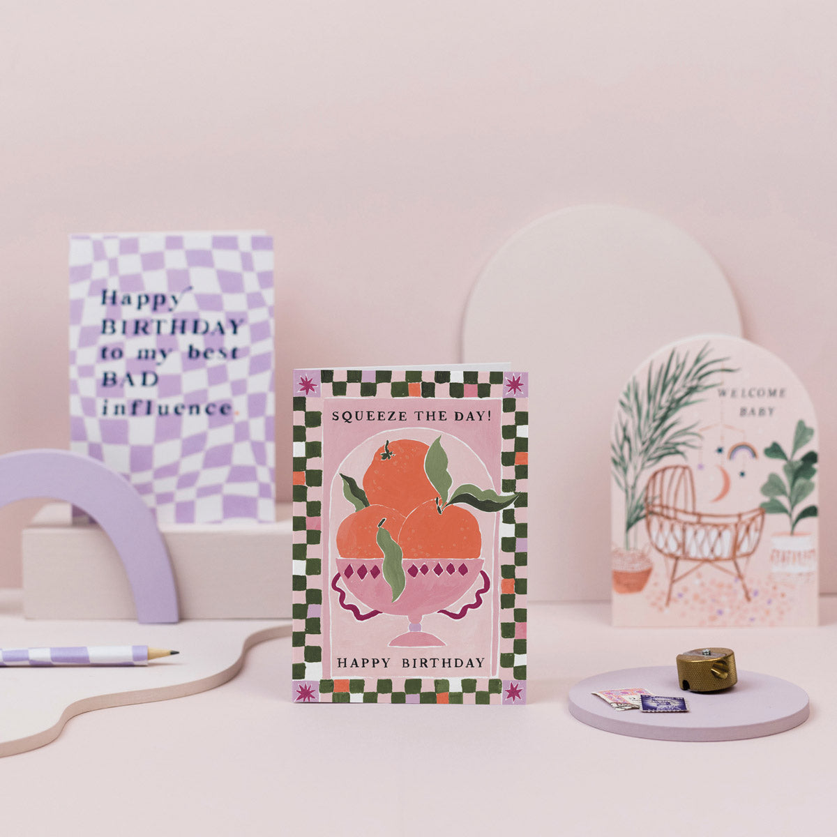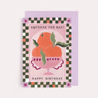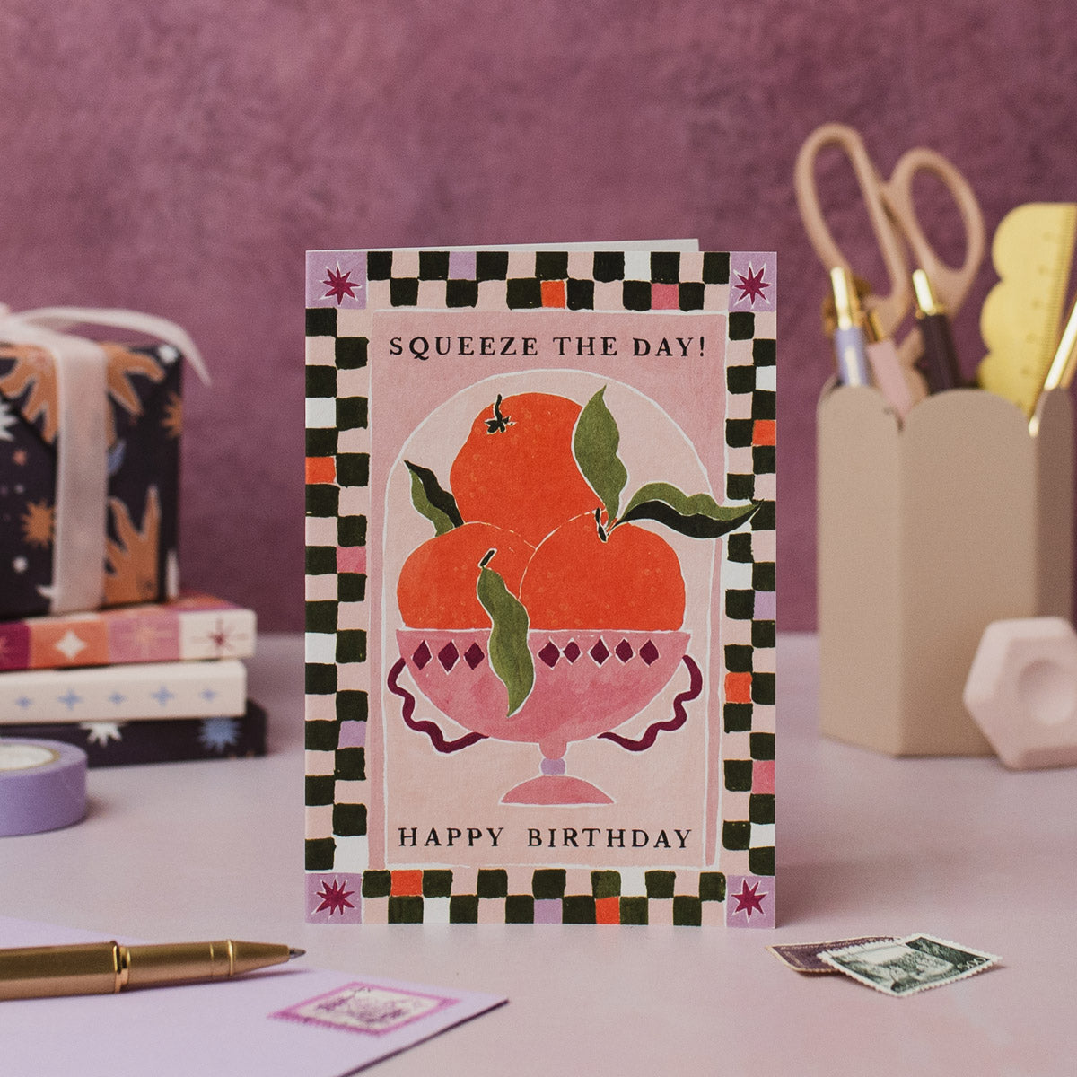 Birthday celebrations only come once a year, so make sure to "Squeeze The Day!" as encouraged by the caption on this funny birthday card. The hand-lettered pun caption on the colourful birthday card accompanies gorgeous artwork of juicy oranges displayed in a dusty rose coloured bowl, with a simple "Happy Birthday" caption underneath. A bold checkered border in green, orange and pink adds the finishing touch to this joyful birthday card design, with the inside blank for a personal message.