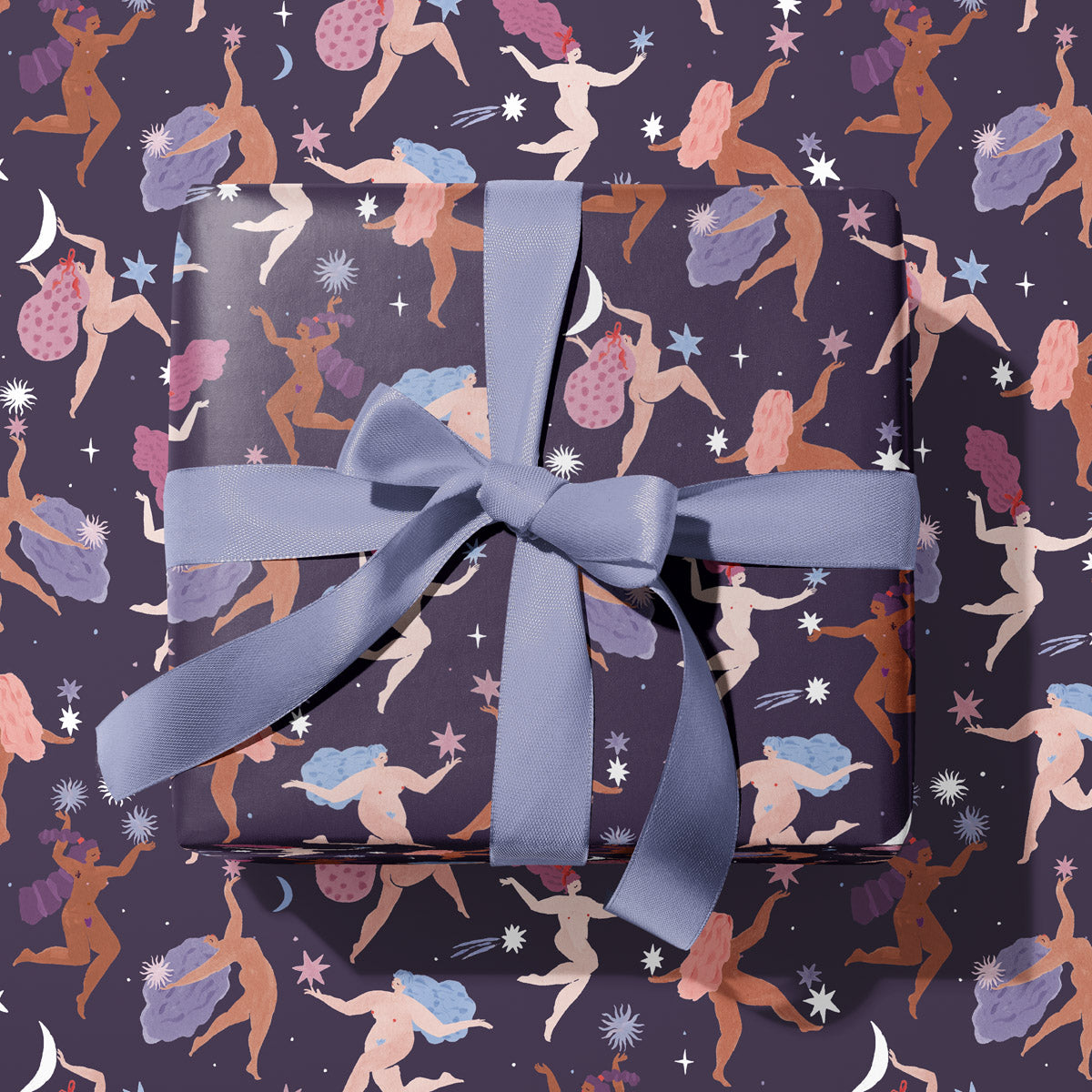 Against the moonlit, starry skied background of this wrapping paper, a coven of naked women delight in the mystery of midnight, allowing their pastel hair to flow freely as they skip joyfully among the constellations. Each one, a celebration of the feminine form, with their curves illustrated with care to create a striking gift wrap sheet.