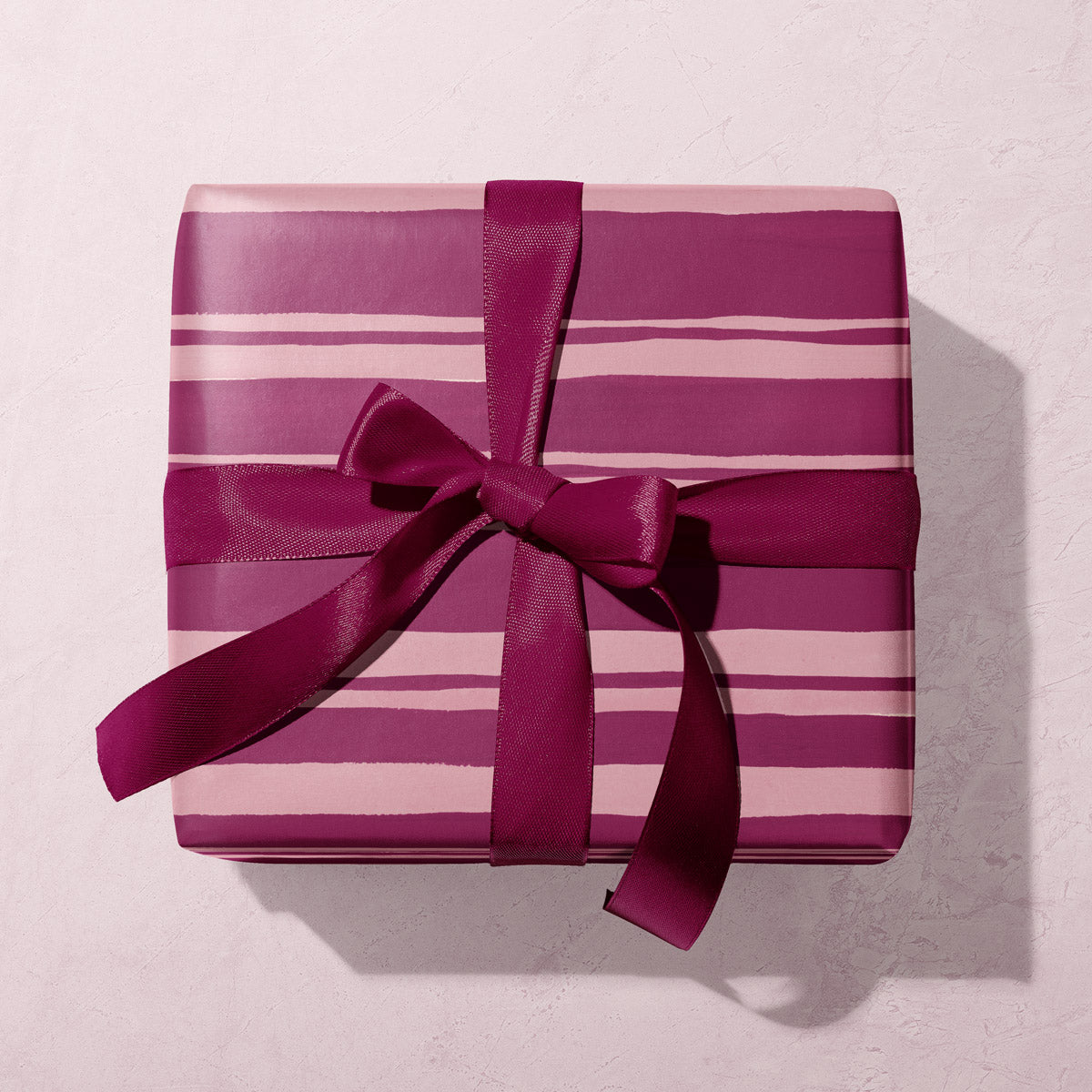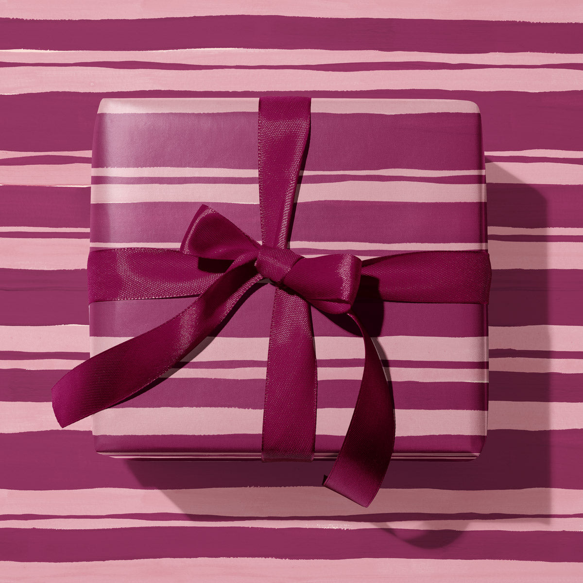 This striped print wrapping paper is printed on velvety soft-touch 120gsm matte stock, giving it a beautifully smooth, elevated feel. Each gift wrap sheet is 100% recyclable, an eco-friendly option without compromising on the luxury quality. Printed with trending berry reds and muted pinks these versatile and commercial wrapping paper sheets can be merchandised either rolled or folded in store.