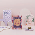 This gorgeous greeting card is the perfect gift for someone who radiates joy, sharing their light with all who touch their lives. The human-made artwork on the friendship card shows an overjoyed sun, rosy-cheeked in delight, with the caption "You make the sun shine brighter" in a hand-lettered font against the midnight blue backdrop. A sunset-inspired border with blocks of lilac, ochre, burgundy and dusty rose surrounds the artwork of the love card, which is blank on the inside, ready to be personalised with a handwritten message.