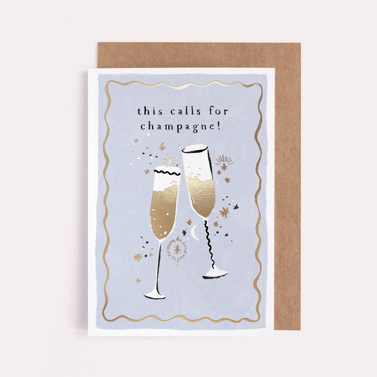 This Congratulations card is a bubbly way to share celebrations for any milestone or achievement that inspires the clinking of champagne glasses! Featuring shimmering gold foil champagne glasses and a hand-lettered “This calls for champagne” caption.