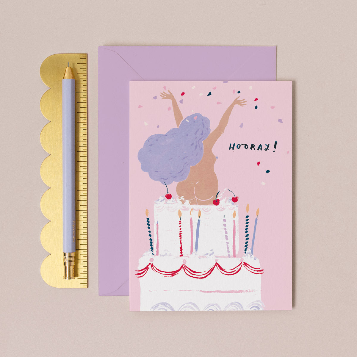 Birthday card with pastel lilac envelope.