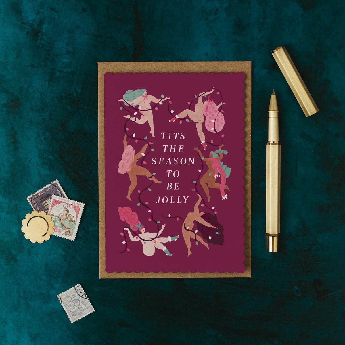 Feminists rejoice! For "Tits the season to be jolly", as the hand-lettered caption on this funny Christmas card proclaims - and this group of naked women agree, joyfully dancing while hanging Christmas lights. The bodacious women enjoy the fes-tit-vities of the season in a celebration of the female form, making this design perfect as a lesbian Christmas card or for any who appreciate a bit of cheeky bum and boob. The deep mulled wine-coloured background of the holiday card ends in a die cut scalloped edge for a luxury finish, and the inside of the Christmas greeting card is blank, ready for a personal handwritten message to be added.