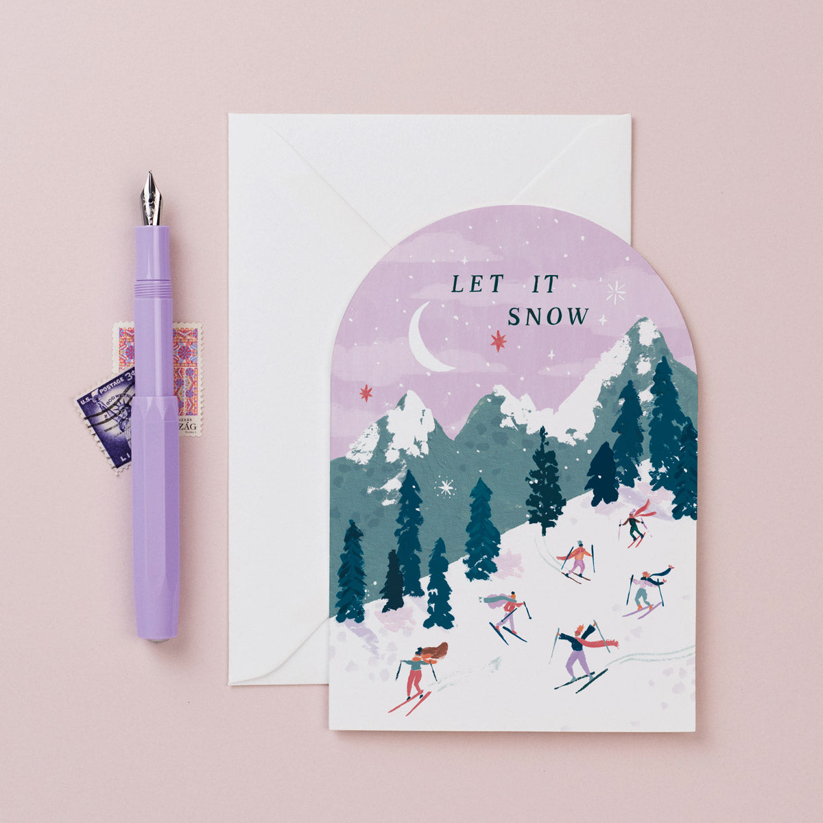 Illustrated Christmas card with skiers on a snowy mountain, featuring the festive handwriting-style captions reading “Let it Snow”. This holiday card serves seasonal vibes and wintery well wishes.