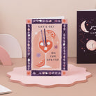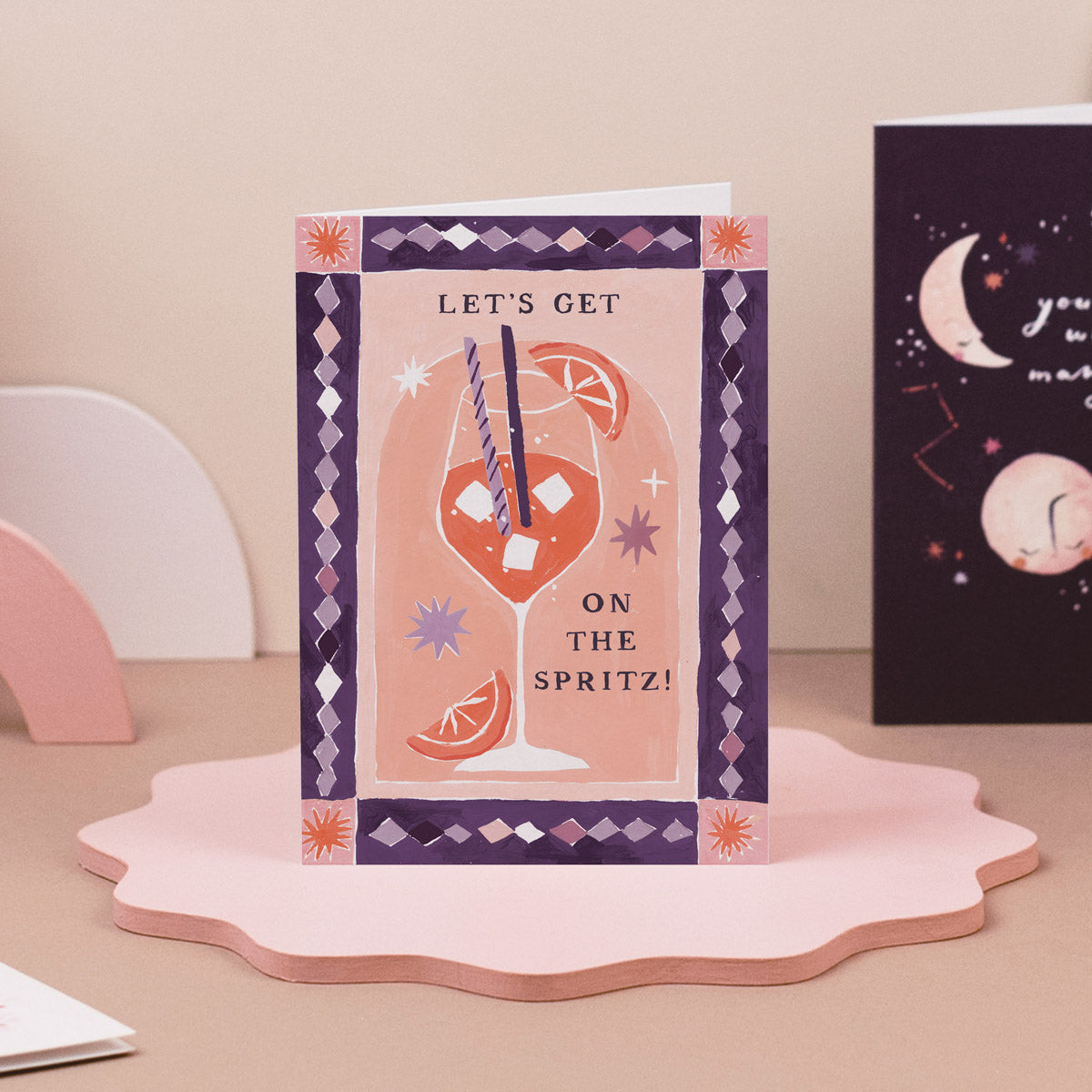 Sun's out, Spritzes out! This vibrant summer birthday card is the perfect tasty treat to kick off celebrations, with gorgeous artwork of a delicious Aperol Spritz taking pride of place in the centre of the design. Along with orange slices and ice cubes, the cocktail is garnished with the birthday card caption reading 'Let's Get On The Spritz!" in a stunning hand-lettered font. The artwork is bordered by a deep midnight purple with diamond and star shapes, adding to the festive vibes, while the inside of the birthday card is blank for a personal message.