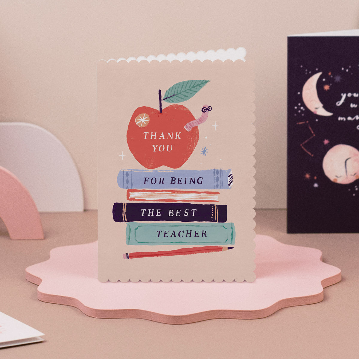 Share your appreciation for your favourite educator with this stunning thank you teacher card. Inspired by the traditional gift of a delicious fresh apple, the hand-illustrated artwork is full of nostalgia, from every detail like the sticker on the apple to the teeny, nerdy glasses on the worm poking out of it. The apple rests on a stack of books, together creating the teacher appreciation card caption which reads "Thank you for being the best teacher", and there is space on the blank inside to add a handwritten message of gratitude that will really make your teacher's day.