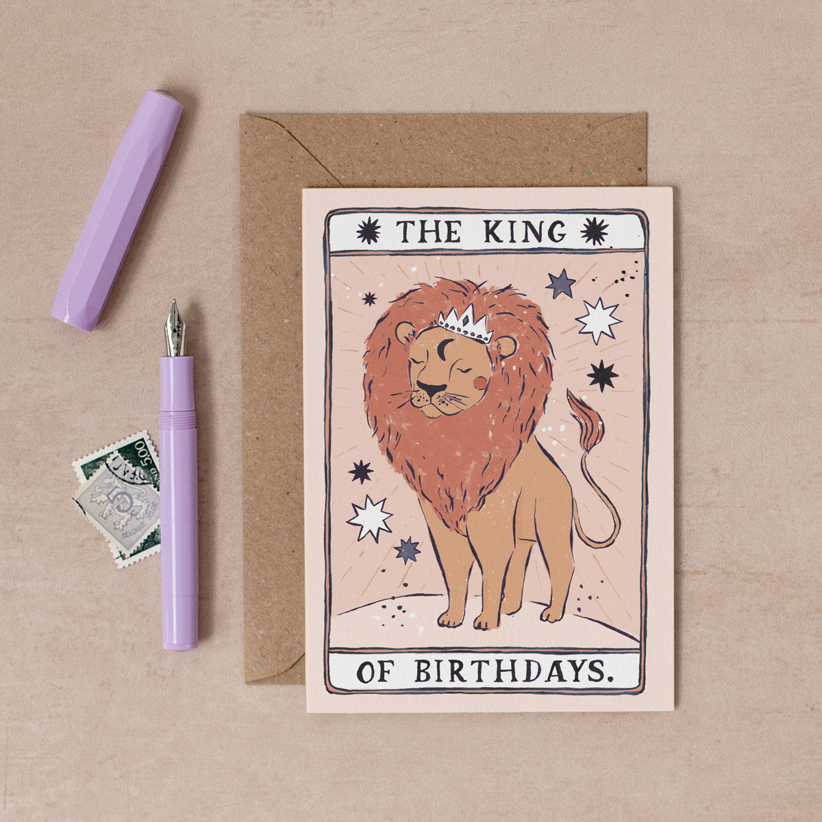 The King of Birthdays card with tarot card style artwork of a proud lion. Perfect for his birthday.