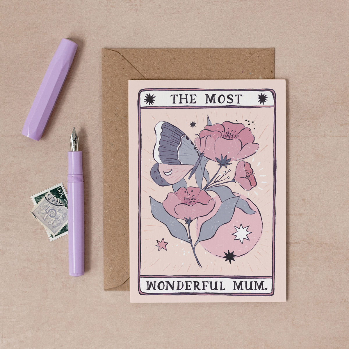 The most wonderful Mum card with tarot card style artwork of flowers with a butterfly, perfect for Mum's birthday or Mother's Day.